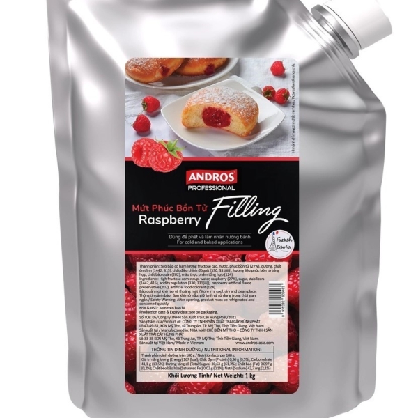 ANDROS Professional tự hào giới thiệu dòng sản phẩm Mứt Phúc Bồn Tử Filling – sự lựa chọn hoàn hảo cho ngành làm bánh chuyên nghiệp. Được thiết kế tiện lợi trong túi nhôm cao cấp, sản phẩm không chỉ giúp tiết kiệm thời gian chuẩn bị mà còn giữ nguyên vẹn hương vị trái cây thơm ngon, đáp ứng mọi nhu cầu chế biến bánh ngọt và đồ uống.
