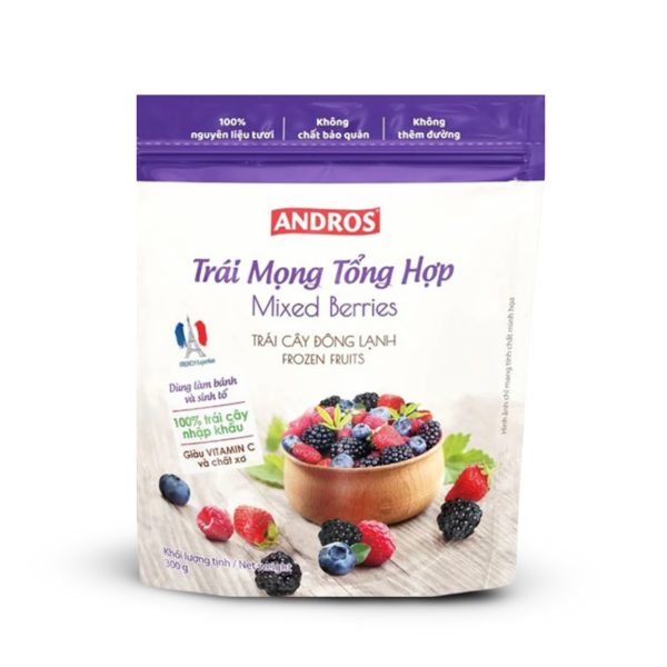 ANDROS Trái Mọng Tổng Hợp Đông Lạnh Túi 300g là sự kết hợp hoàn hảo từ những loại trái mọng ngon nhất như việt quất, mâm xôi, dâu tây, và phúc bồn tử. Sản phẩm được chế biến bằng công nghệ cấp đông siêu tốc (IQF), đảm bảo giữ trọn vẹn hương vị, màu sắc và chất dinh dưỡng, mang đến sự tiện lợi và sáng tạo không giới hạn cho bữa ăn của bạn.